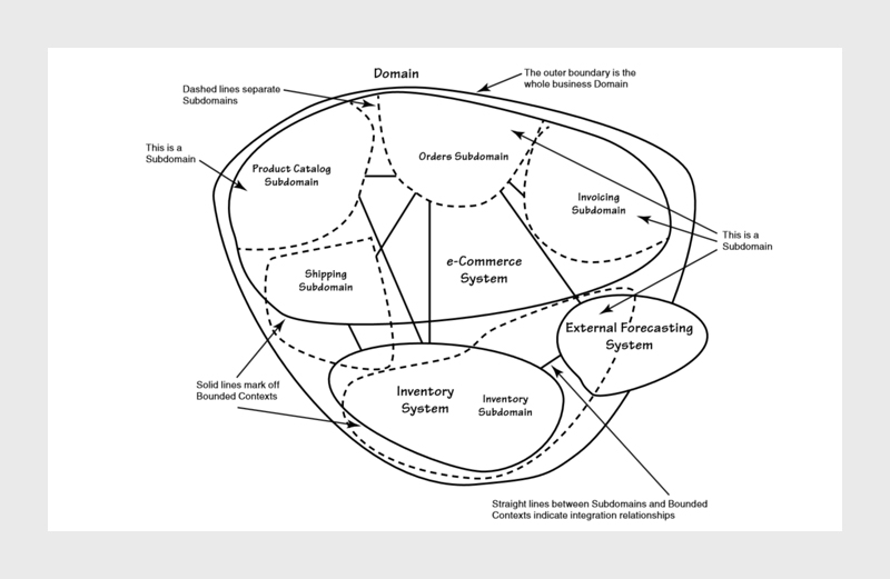 رویکرد طراحی دامنهمحور با استفاده از الگوهای استراتژیک و اصل تقسیمبندی، تلاش میکند دامنههای پیچیده را به بخشهای کوچکتر و قابل مدیریت تقسیم کرده و وابستگیهای بین آنها را به شکل صحیحی کنترل کند. در حالت ایدئال، هر SubDomain متناظر با یک Bounded Context است، اما در عمل ممکن است این تطابق کامل نباشد.